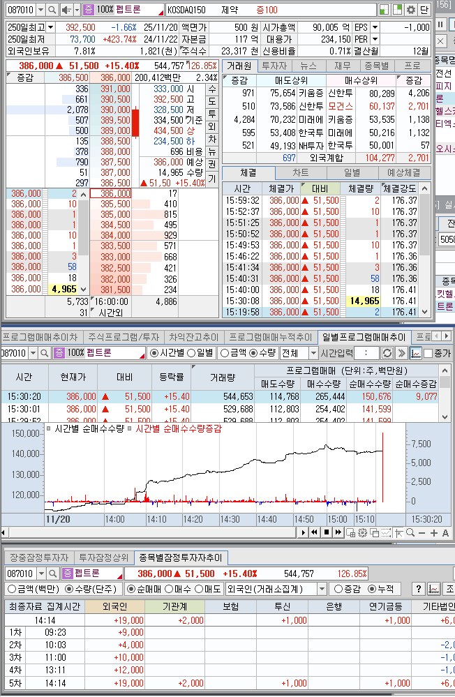 매수한 종목은 펩트론으로 오전부터 오후까지 물량이 들어오고 프로그램 매수가 계속 들어옴(외국계)