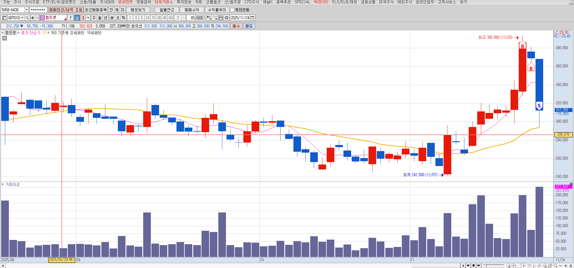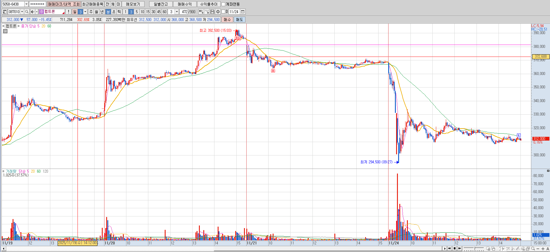 펩트론 : 신고가에 거래대금 상위에 나와 매수하였으나 다음날 갭하락으로 출발