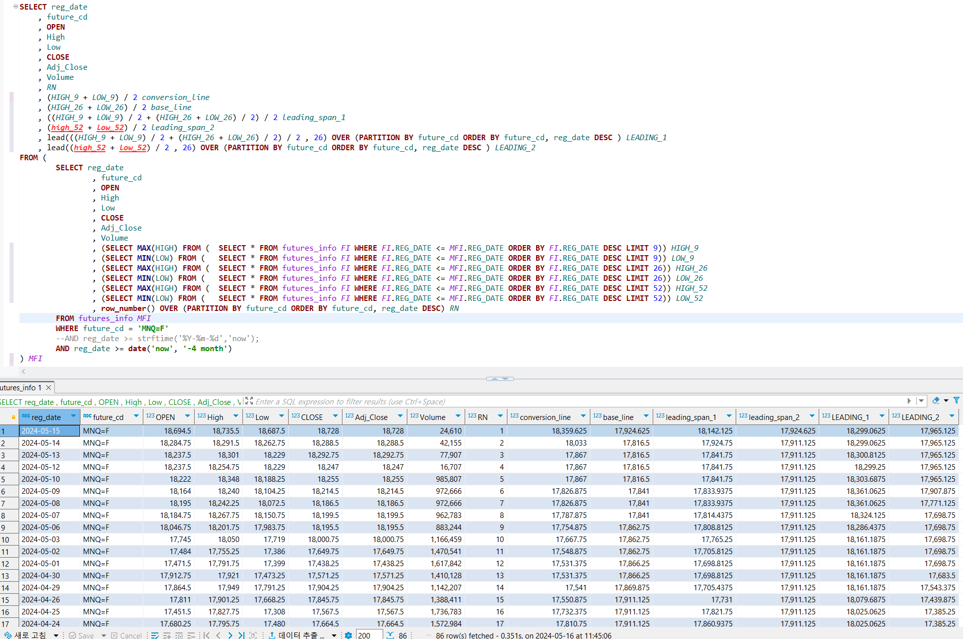 , lead(((HIGH_9 + LOW_9) / 2 + (HIGH_26 + LOW_26) / 2) / 2 , 26) OVER (PARTITION BY future_cd ORDER BY future_cd, reg_date DESC ) LEADING_1