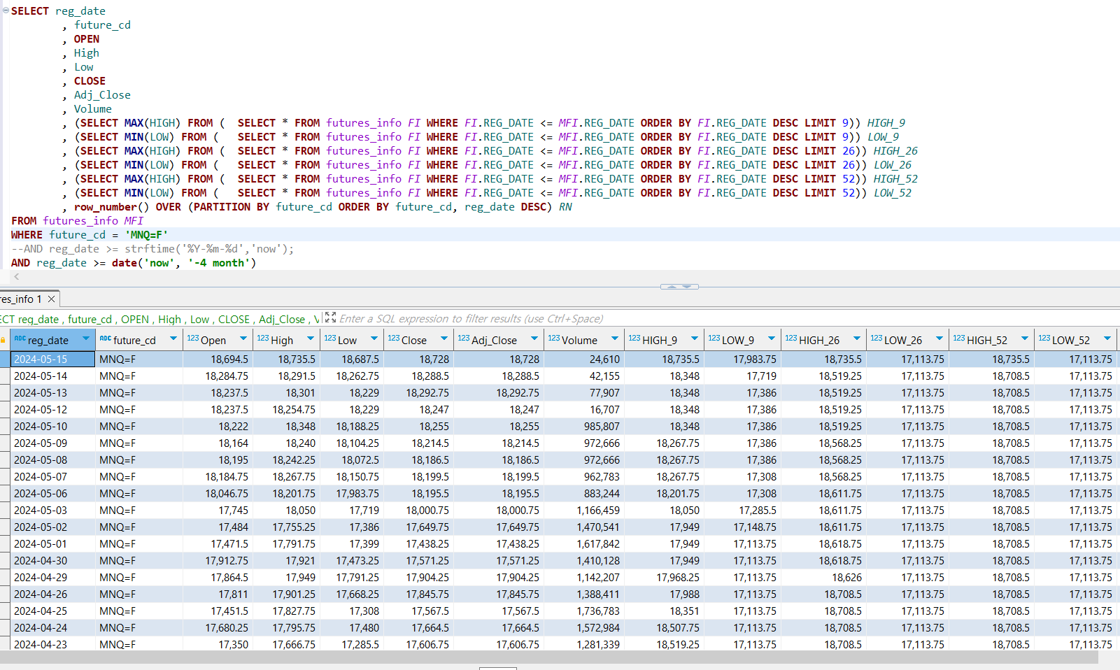 , (SELECT MIN(LOW) FROM (SELECT * FROM futures_info FI WHERE FI.REG_DATE <= MFI.REG_DATE ORDER BY FI.REG_DATE DESC LIMIT 52)) LOW_52